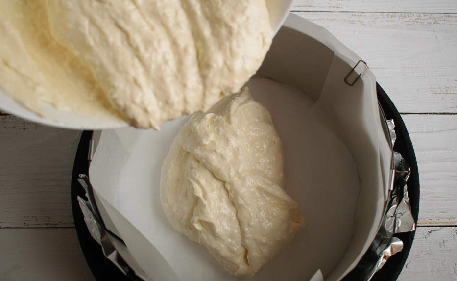Выкладываем бисквитное тесто смазанную разъемную форму, выпекаем 40 минут при температуре 180°С, охлаждаем и разрезаем на три коржа.