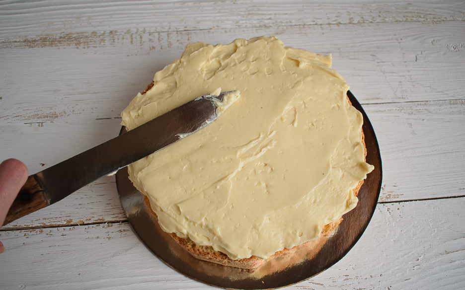 - Полученный крем щедро наносим на каждую часть бисквита, соединяем белые коржи в изысканное изделие.