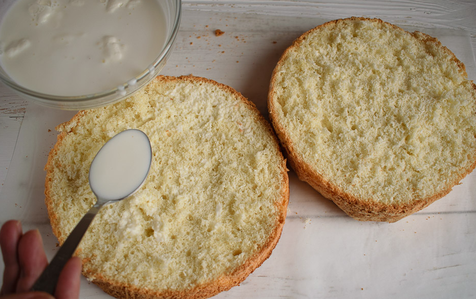 Пропитать молоком основу бисквита для придания сочности (по желанию).