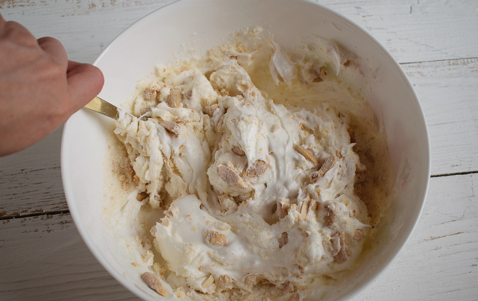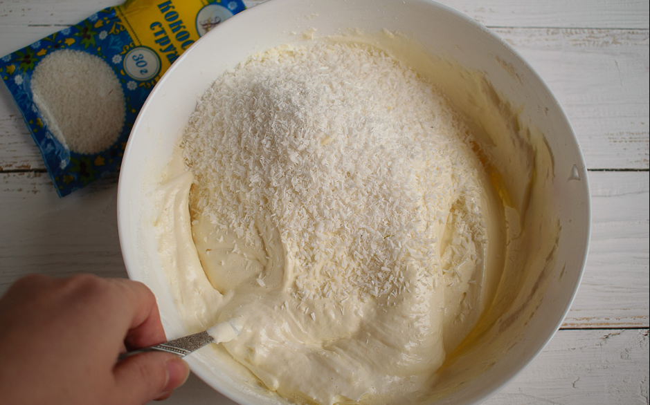 - Стружку кокоса добавить в получившийся пышный крем и хорошенечко перемешать.