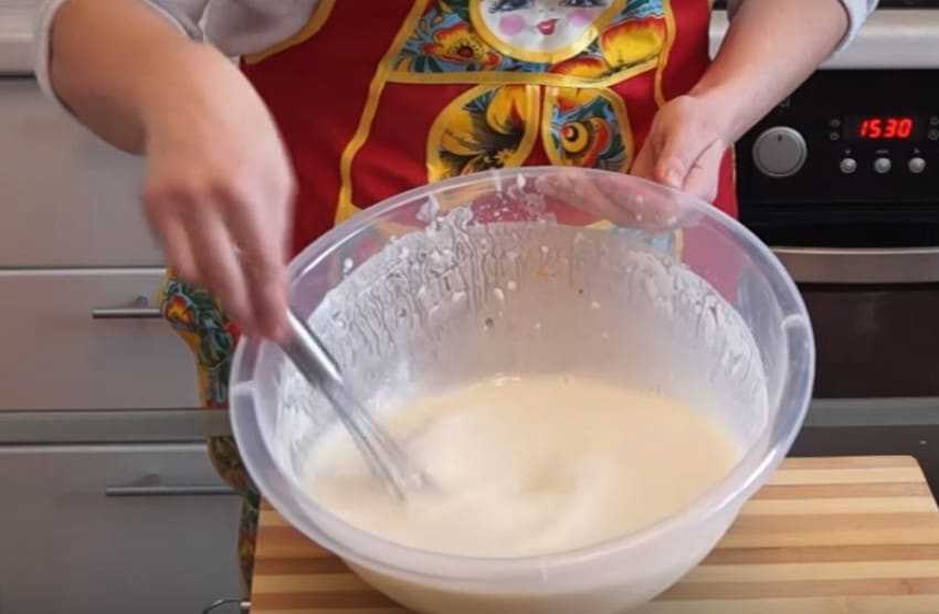 - Смешайте муку с крахмалом, потом пересыпьте их в молоко и снова взбейте венчиком.
