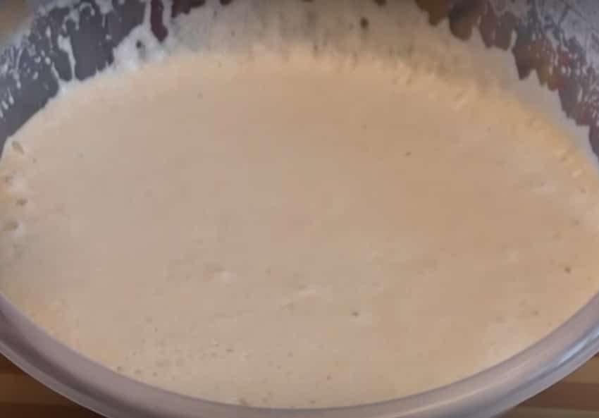- Молоко немножко подогреть, вбить к нему яйца, всыпать сахар и соль. Хорошенько всё замешать венчиком, лучше даже миксером.