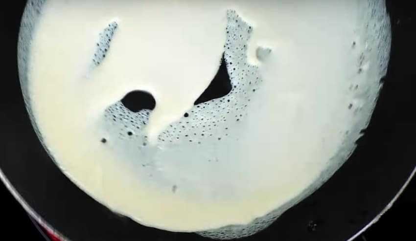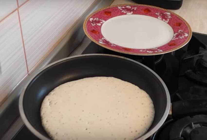 Если случилось так, что налили слишком много — можно слить через край сковороды излишки (это нормальный прием, которым пользуются даже опытные повара), но смотрите за тем, чтобы капли теста не потекли на дно сковороды.