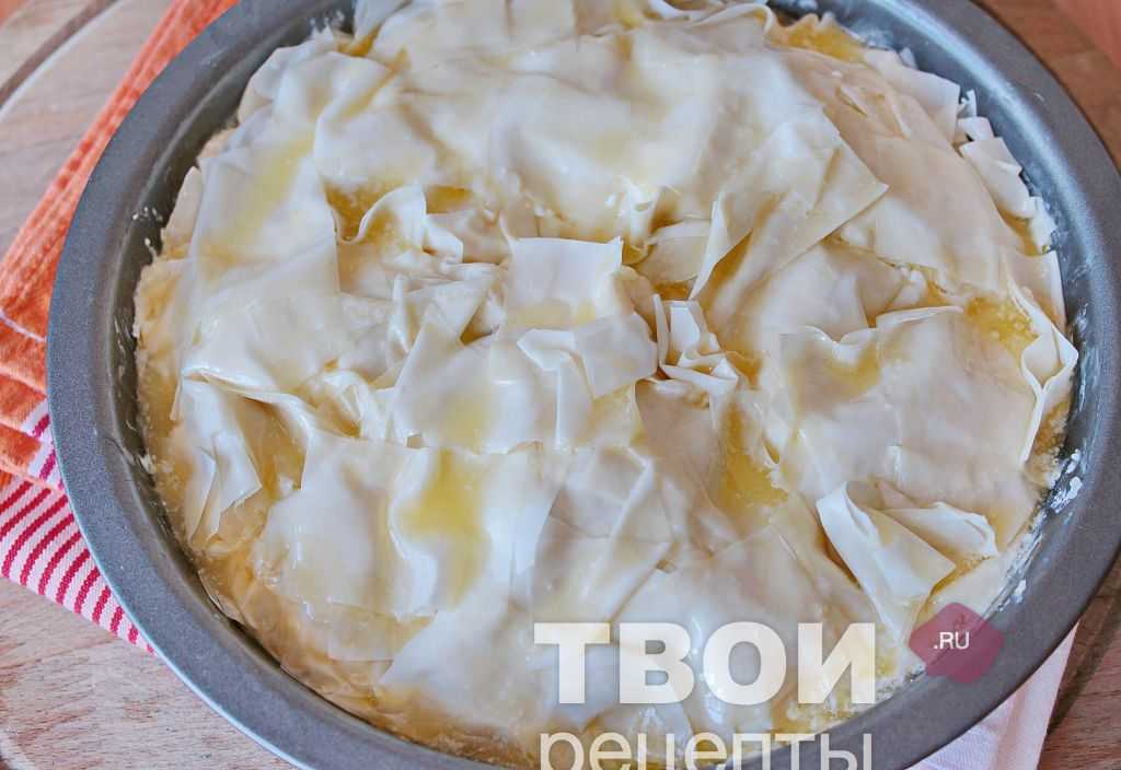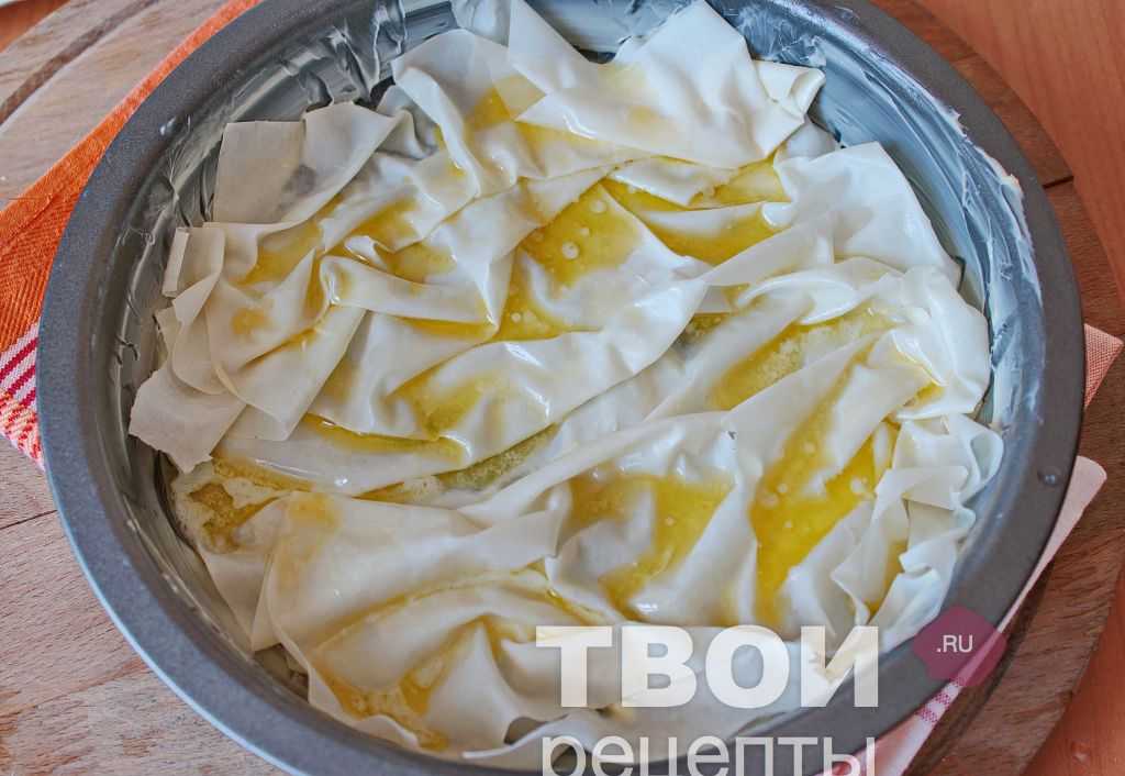 Один пласт фило сложить вдвое и уложить в противень, собирая складки. Полить растопленным маслом.
