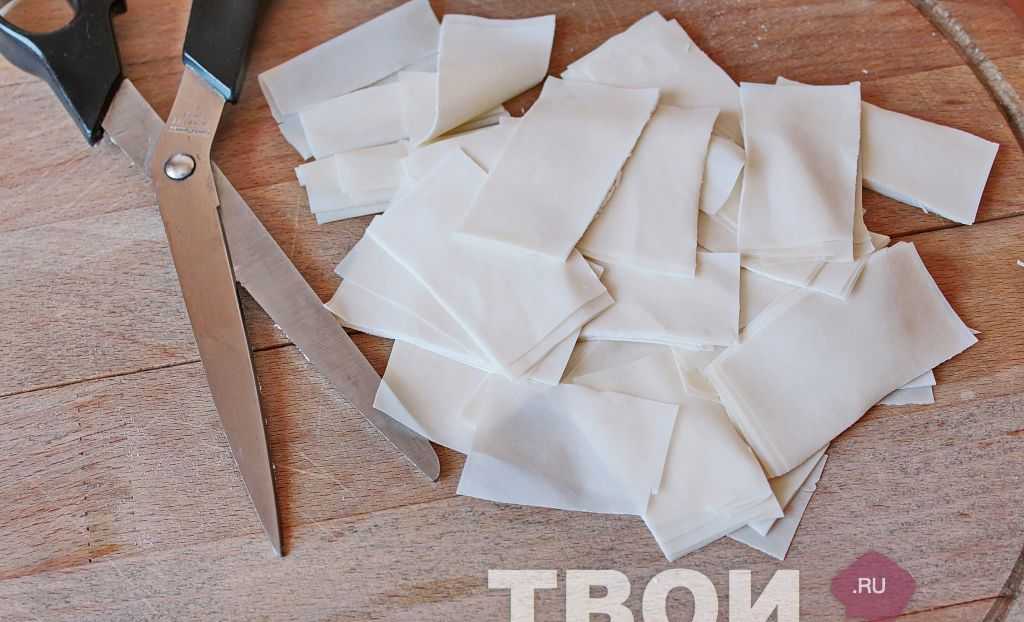 В Болгарии тесто фило называется «точени кори» Листы теста очень тонкие, поэтому их складывают в маленькие стопочки, промазывая маслом. Для этого удобно использовать силиконовую кисточку. Пока занимаемся подготовкой стопок, остальные листы лучше чем-то накрыть, чтобы они не пересыхали. В некоторых рецептах обходятся без промазывания. Выбор начинок огромен, можно приготовить баницу как с традиционной болгарской брынзой, так и с менее известными наполнителями. Зелень, мясо, рыба, яйца, творог, тертые яблоки, овощи – вариантов масса. Понятно, что чем больше начинки, тем лучше, но слишком усердствовать не стоит, иначе тонкие коржи порвутся, и начинка вытечет. Особенно экономно нужно раскладывать сочные наполнители, такие как натертая тыква или яблоко.