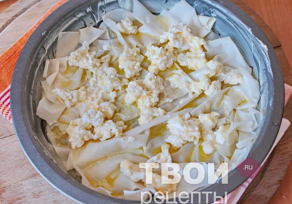 На тесто выложить начинку, и так повторить со всеми листами фило.