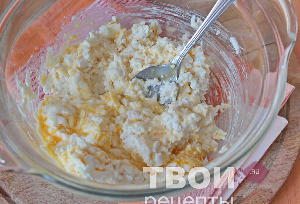 - После этого добавьте в ту же миску творог, сахар, одно взбитое яйцо и один белок. Желток со второго яйца оставьте для смазывания.