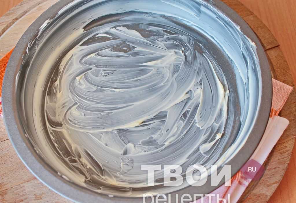 - Подготовить невысокую форму для выпечки и смазать дно маслом.