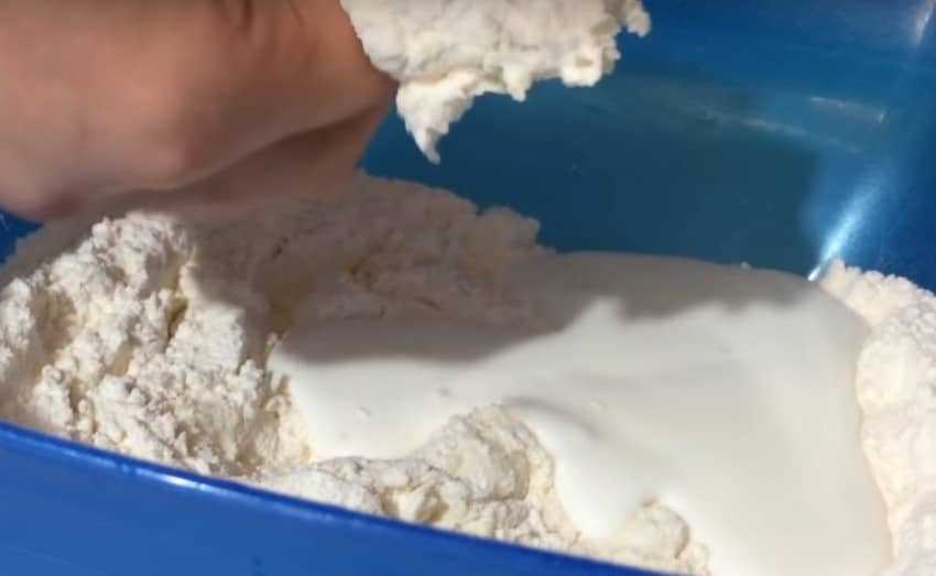 - 3. Замесить руками клейкое тесто, оставить на 30 минут настаиваться.