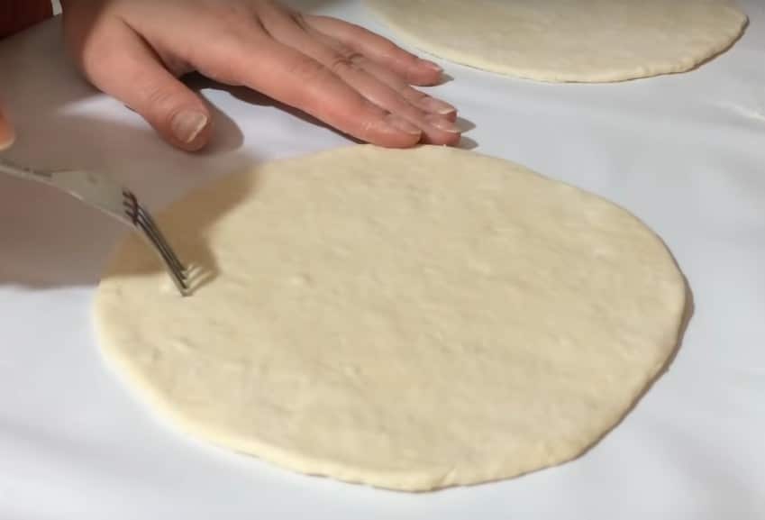 Делим на 5-6 частей и скатываем в шарики. Каждый шарик раскатываем в лепешку, подсыпая муку, чтобы тесто не прилипало.