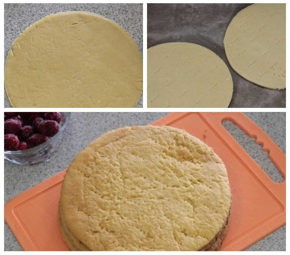 - Заготовку для коржей убираем в холодильник на 20 минут. Затем достаем, делим на 6 равных частей. Каждую раскатываем в круг толщиной примерно в 3 мм, накалываем вилкой, чтобы при выпечке они не вздувались.