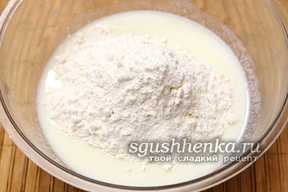 Просеять муку и добавить в сладкую жижу 5-6 ложек. Размешать до полного удаления комочков, постепенно добавляя оставшееся количество муки. На выходе тесто должно получиться тесто, схожее по консистенции с густой деревенской сметаной.