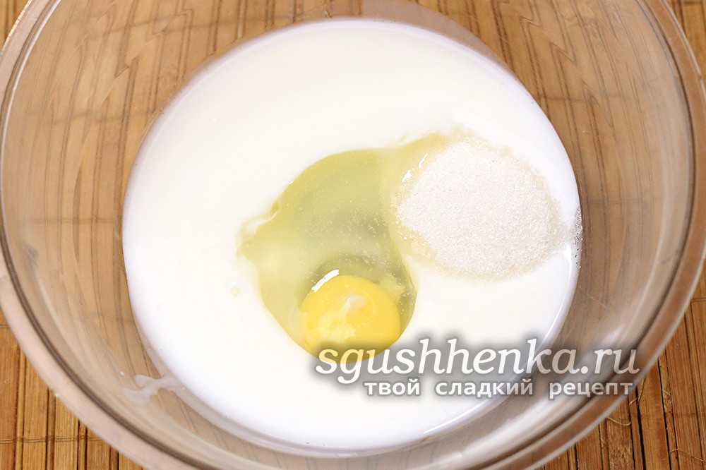 Готовим по следующей схеме: для начала соедините сахарный песок с яйцом и кефир с солью. Хорошенько взбейте все ингредиенты венчиком или с помощью миксера. В отдельную посуду выкладываем творог и разминаем вилкой, чтобы не было комочков.