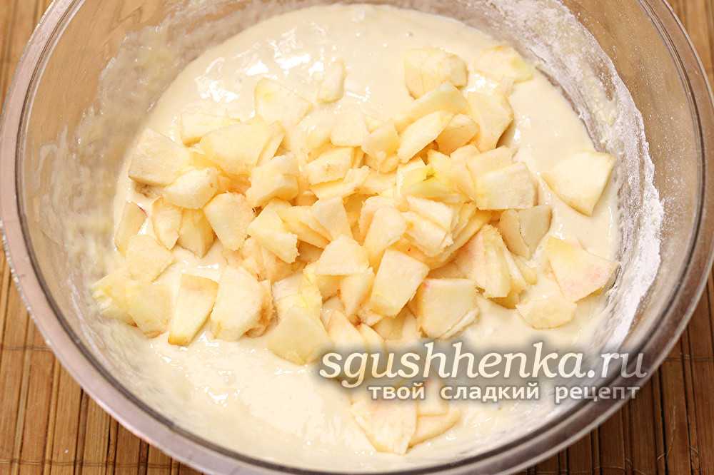 Очистить яблоки. Вырезать семенную камеру. Нарезать кубиками произвольной формы. Добавить в полужидкое тесто. Перемешать.