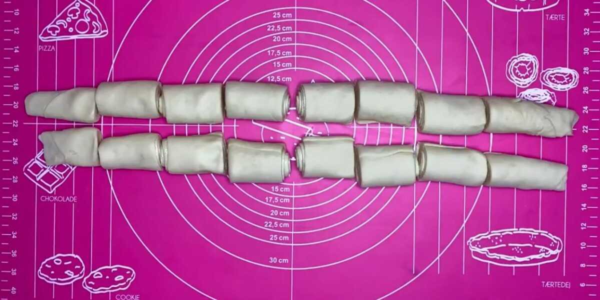 3. Закатанный рулет разделите на несколько равных частей и дайте им чуть постоять.