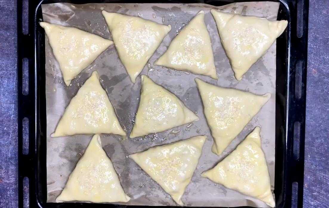 Немного раскатать каждую лепешку, положить в середину фарш. Сформировать треугольные пирожки, смазать взбитым яйцом и посыпать кунжутом.