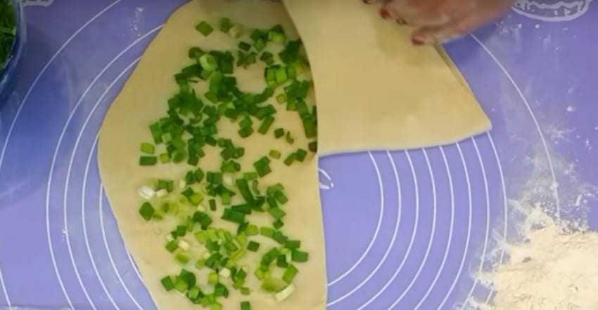 5. Тесто разделите на несколько частей – будущих лепешек. Раскатайте каждый комочек скалкой и выложите сверху измельченный лук, покрывая ¾ поверхности.