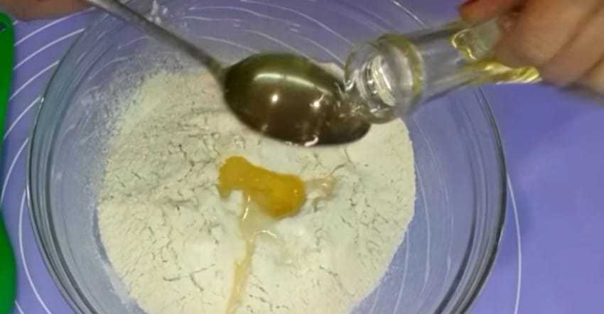 - Далее следует насыпать ее горкой, сделав углубление и влив в него подсолнечное масло с водой. Ингредиенты необходимо перемешать при помощи ложки до загустения, а затем замесив тесто при помощи рук. После заготовку нужно накрыть полотенцем и оставить настаиваться на протяжении 10 – 15 мин.