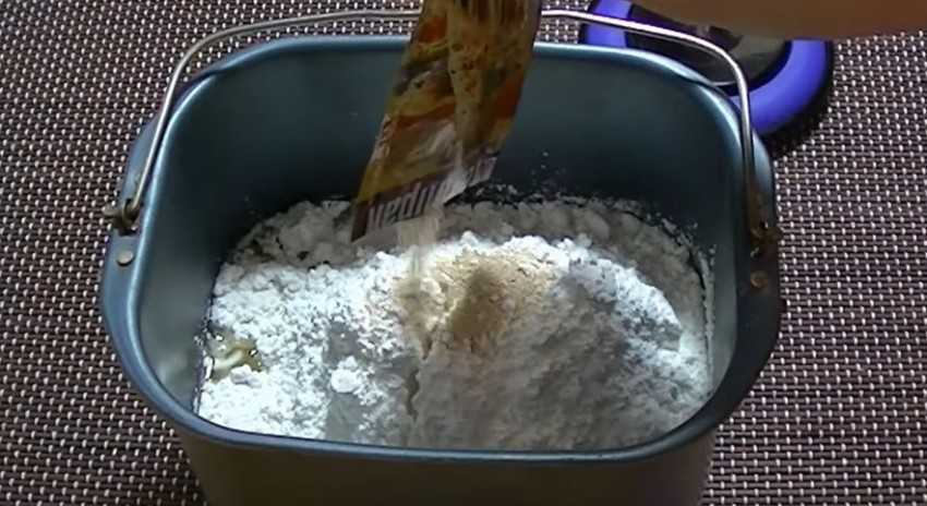 2. Влейте подсолнечное масло и всыпьте муку. В последнюю очередь добавьте сухие дрожжи.