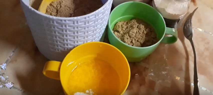 - Постепенно доливать теплую воду с разведенными в ней ингредиентами.