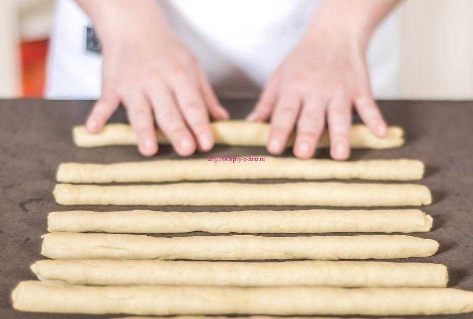 Готовое тесто делим на несколько равных частей и пальцами раскатываем из них соломки длиной в среднем 20 см. Добиваться идеально ровной толщины по всей длине не обязательно.