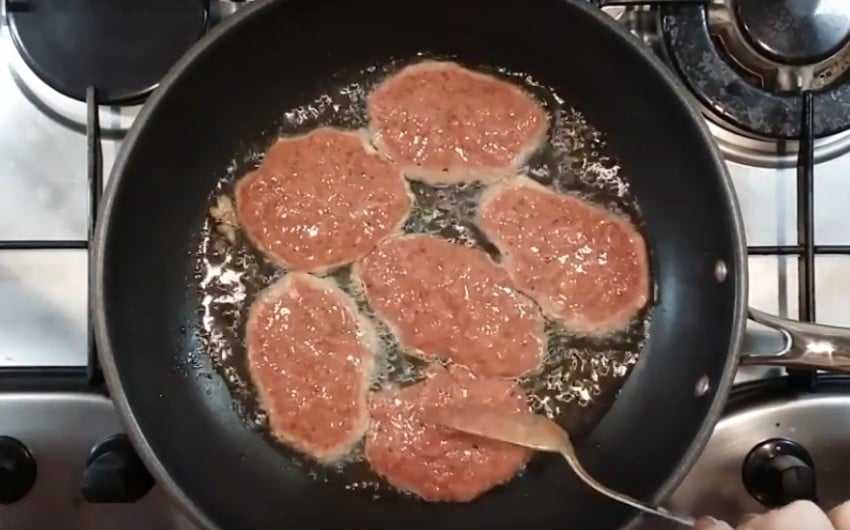 - Разогрейте на сковородке масло, выложите в него столовой ложкой несколько порций фарша, смешанного с овощами.