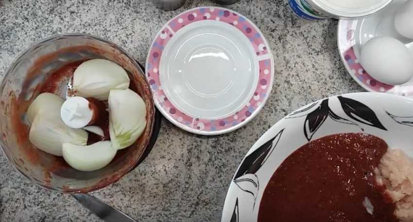 2. Лук порежьте на куски и тоже перебейте на блендере. Можно использовать мясорубку, но с использованием бытовой техники процесс пойдет быстрее.