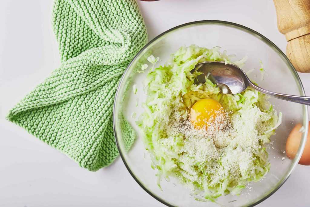 6.Приступайте к замешиванию теста. Кабачковую массу пересыпьте в удобную миску. Влейте к ним яйца и перемешайте.
