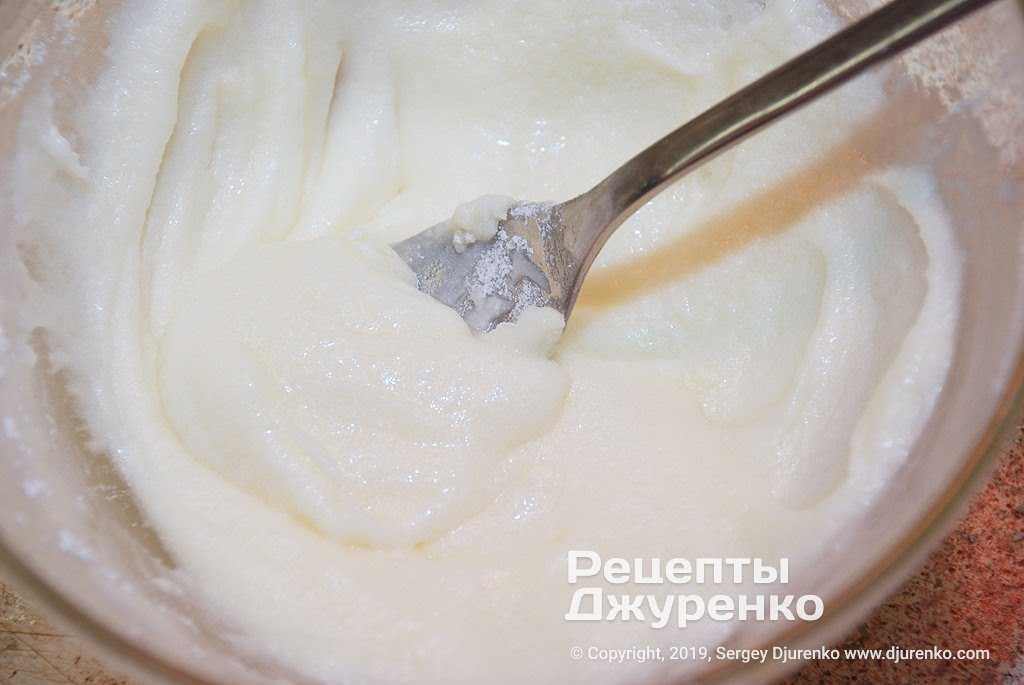 - Взбиваем охлажденные сливки (50 г) и сахар (50 г)