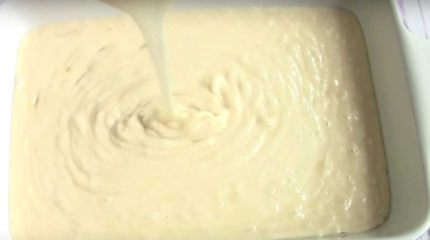 В жидкость маленькими порциями добавляют муку и разрыхлитель, не переставая размешивать тесто.
