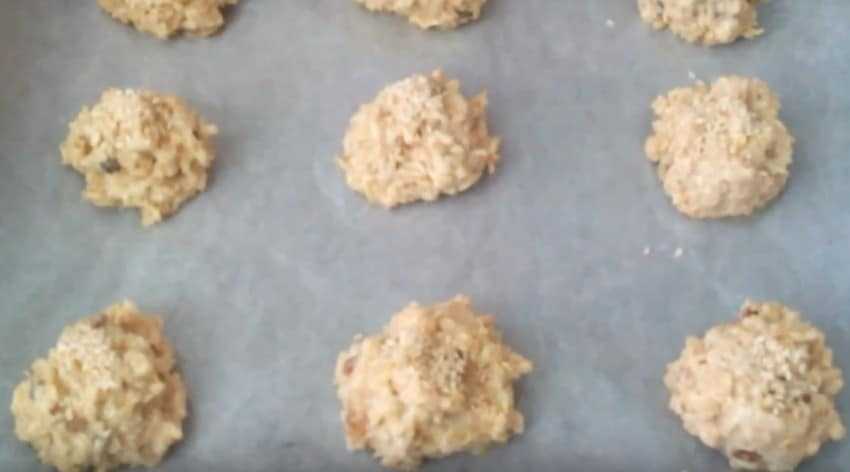 - На противень с пергаментом ложкой выкладывают тесто. Печенье пекут при 190°С 15 минут.
