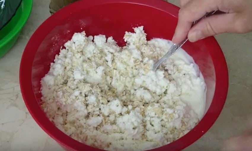 - Яйца взбиваем в отдельной тарелке. Вливаем в овсяно-кефирную смесь. Смешиваем. Накрываем полотенцем и даем постоять около получаса. Крупа должна разбухнуть.