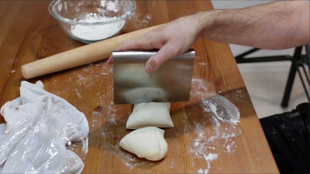 - Взять кусок теста, раскатать в колбаску, нарезать на куски.