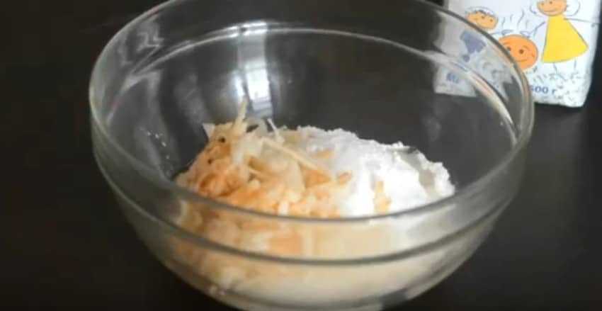 - Муку соедините с содой погашенной уксусом и перемешайте.