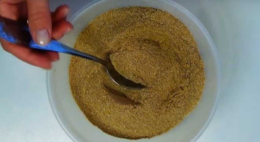 Гречневую крупу следует перебрать, поместить в кофемолку и измельчить до состояния муки. Можно поискать готовую гречневую муку в магазине. К гречневой муке добавляются отруби, а также очищенные дробленые грецкие орехи.