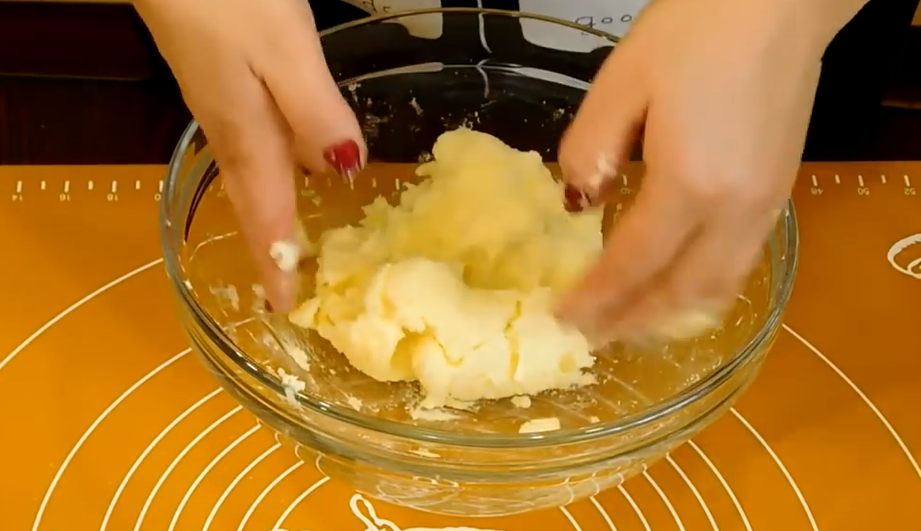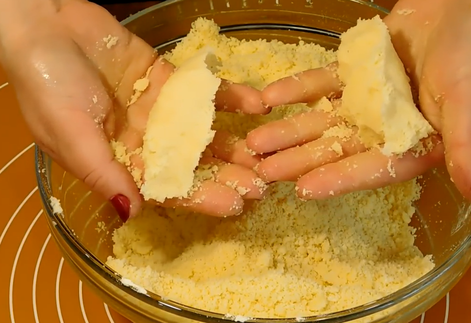 - Готовое тесто должно быть в виде крошки. Не нужно вымешивать ингредиенты до состояния пластичной массы.