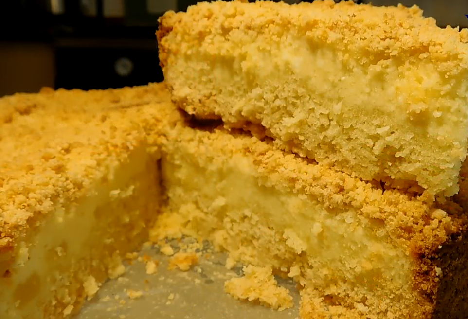 Этот пирог состоит из трех слоев. Первый – тонкий, полученный из песочного теста, второй – творожная начинка, третий – хрустящая крошка. Выпечка получается достаточно интересной и очень вкусной.