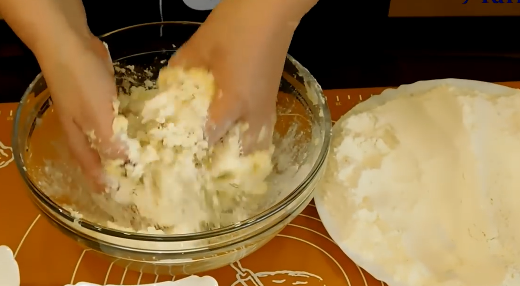 5. Должно получится довольно сухое, но в то же время и липкое тесто. При сжатии получаются комочки, которые в то же время легко рассыпаются.