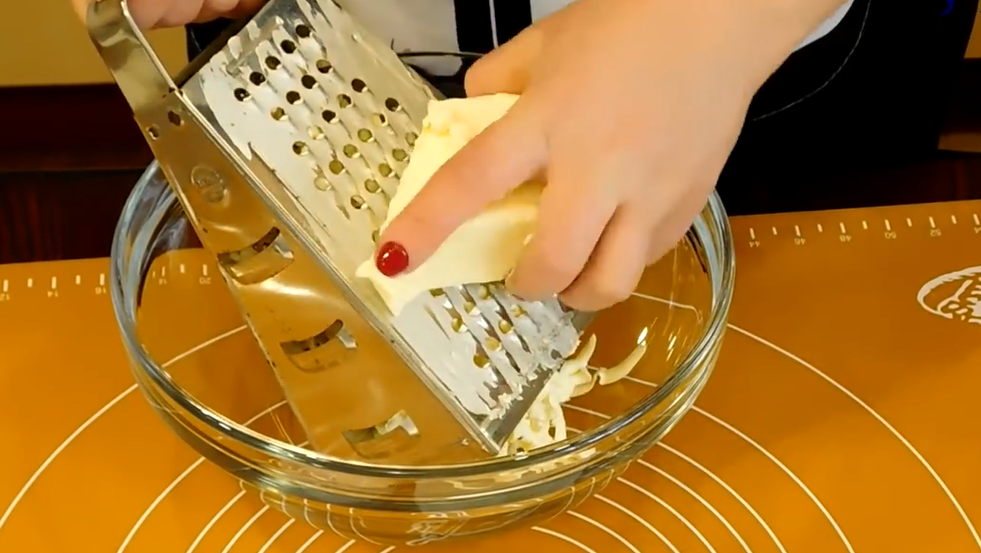 - Сливочное масло достаньте из холодильника перед самой готовкой, чтобы оно было твердое. Лучше положить его минут на 15 в морозильную камеру. Масло мы будем натирать на крупной терке.