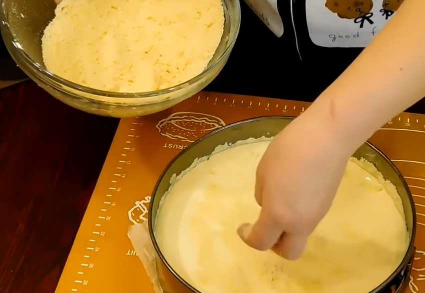 8. В разъемную форму застилаем бумагу для запекания, смазываем ее сливочным или растительным маслом. На дно высыпаем 2/3 всего теста (крошки), легонько утрамбовываем руками и по бокам формируем бортики.