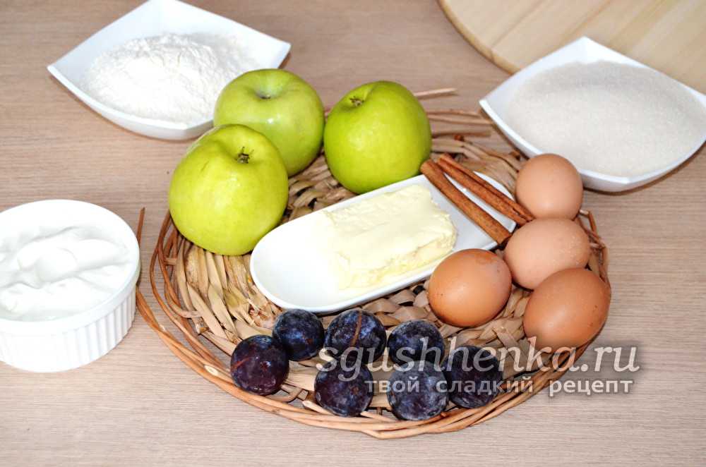 Сливы для пирогов можно использовать любого сорта. Если косточка не хочет отделяться, то ее всегда можно обрезать ножом либо срезать кусочками мякоть. Желательно не закладывать в пирог очень сочные и перезрелые сливы, которые выделять много жидкости при термической обработке. Яблоки же можно брать абсолютно любые. Фрукты нарезают кусочками такой формы и размера, которая указана в рецептуре.