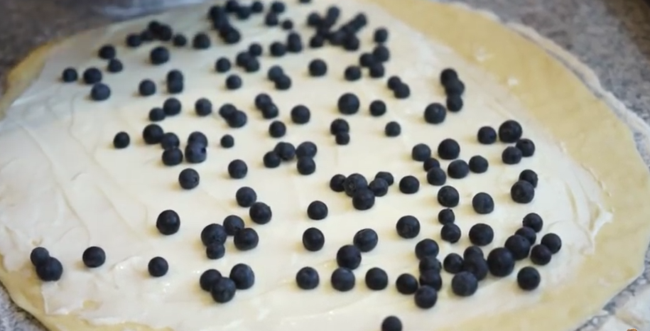 8. Сверху на крем посыпаем ягоды черники, оставляя также края теста свободными от начинки.