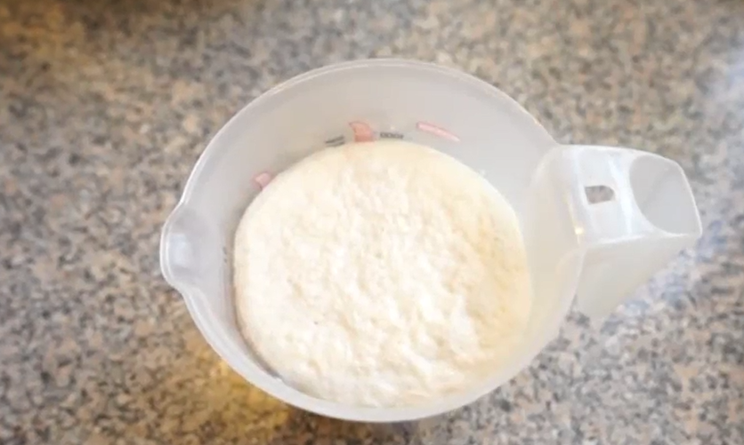 - Готовим опару. Для этого слегка нагреваем молоко и в нем растворяем дрожжи. Добавляем 2 ч. л. сахара и перемешиваем. Оставляем опару подниматься в теплом месте минут 10-15. Если дрожжи свежие, опара поднимется в 2-3 раза.