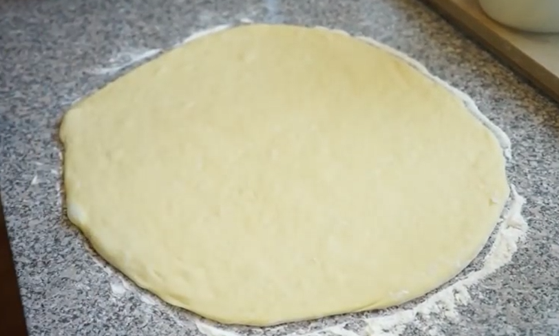 6. Тесто увеличилось. Выкладываем его на присыпанный мукой стол. Руками от краев собираем его со всех сторон в комок, разминаем немного и с помощью скалки раскатываем круг толщиной примерно 0,5 см.