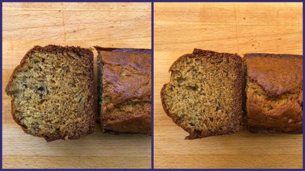 Что произойдет, если добавить больше масла? Вкус и аромат бананов окажется словно приглушенным, но жирности ощущаться не будет. Структура выпечки также изменится мало. Вершинка и корочка остаются сухими, а вот внутри хлеб имеет влажность.