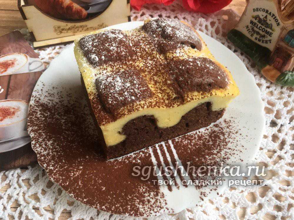 А вот ломтики пирога, который выпекался на обычном противне. Сам корж гораздо тоньше, но такое тесто лучше выпекается и внутри остается меньше влаги. Идеально подойдет для тех, что не любит «мокрые» торты или пироги.