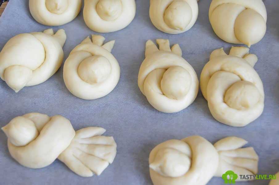 Когда подойдут, смазываем булочки сладким чаем (вместо яйца), чтобы подрумянились.