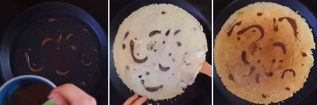 На плите раскаляют сковородку с антипригарным покрытием. Тесто для блинчиков еще раз перемешивают и набирают половину половника. Льют массу на середину и быстро распределяют по всей поверхности. В процессе приготовления блинчики быстро начнут покрываться дырочками. При помощи силиконовой лопатки переворачивают блинчик.