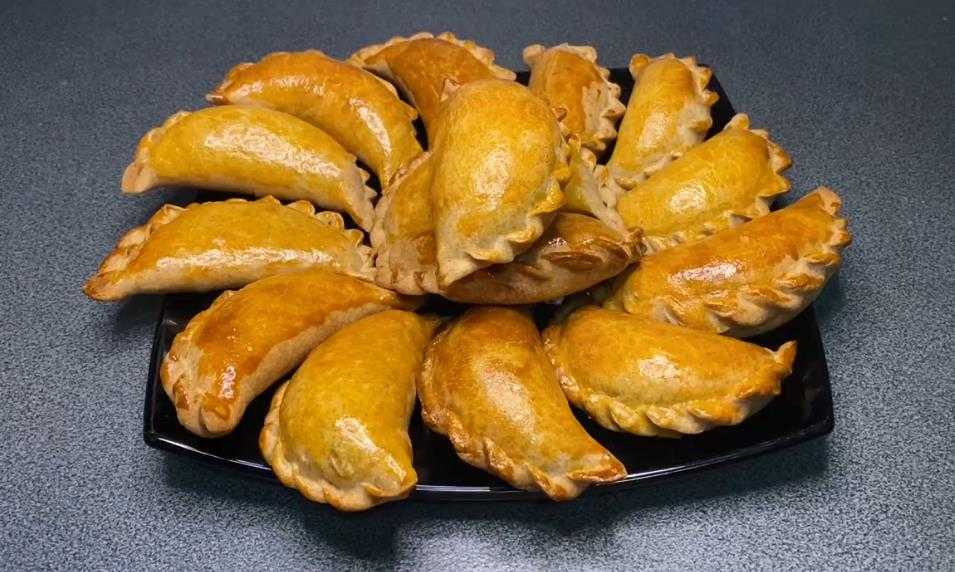 Тесто раскатать в толстый жгут, разрезать на одинаковые шайбы. Раскатать лепешки, толщина которых составляет 3 миллиметра, положить в середину начинку, защипнуть края.