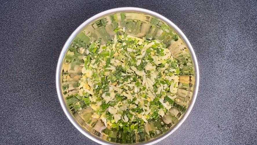 Отварить яйца до полной готовности 10 минут, натереть на крупной терке. Мелко нарезать только зеленую часть лука, соединить с яичной массой, солью, перцем и куркумой.